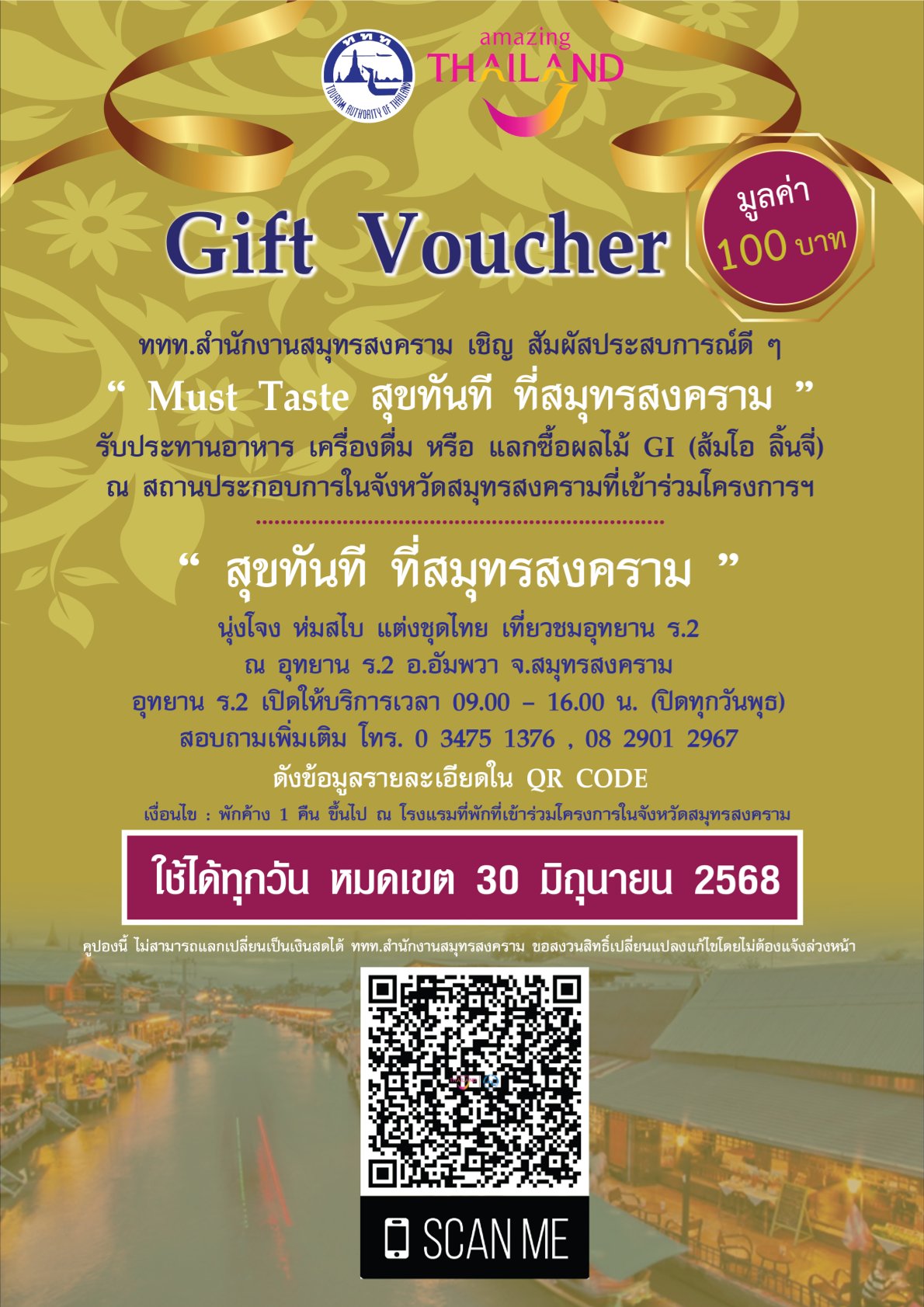 โดย ททท.สำนักงานสมุทรสงคราม มอบคูปองส่วนลด Gift Voucher มูลค่า 200 บาท (1 ห้อง/คูปอง 2 ใบ) ให้กับนักท่องเที่ยวที่เดินทางมาท่องเที่ยวและพักค้างคืนที่สมุทรสงคราม อย่างน้อย 1 คืนขึ้นไป ณ โรงแรมที่เข้าร่วมโครงการฯ สำหรับใช้เป็นส่วนลดในการรับประทานอาหาร เครื่องดื่ม แลกซื้อผลไม้ในสวน Young Smart Farmer สมุทรสงคราม และของฝาก/ของที่ระลึก ในสถานประกอบการร้านอาหาร ร้านคาเฟ่ สวนผลไม้ แหล่งท่องเที่ยว และร้านของฝาก/ของที่ระลึก ที่เข้าร่วมโครงการฯ กว่า 90 แห่ง หรือร่วมกิจกรรมนุ่งโจง ห่มสไบ แต่งชุดไทย เที่ยวชมอุทยาน ร.2 จำนวน 2,500 สิทธิ์ ตั้งแต่วันนี้เป็นต้นไปถึงเดือน มิถุนายน 2568 หรือครบจำนวนสิทธิ์ที่กำหนด !!