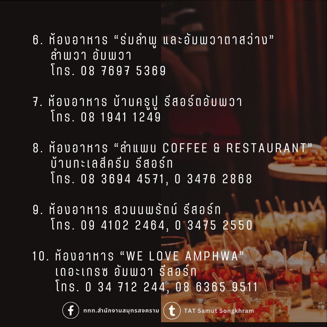 สอบถามรายละเอียดเพิ่มเติมได้ที่ ททท.สำนักงานสมุทรสงคราม โทรศัพท์ 0 3475-2847-8 หรือ Inbox Facebook : ททท.สำนักงานสมุทรสงคราม TAT Samut Songkhram
