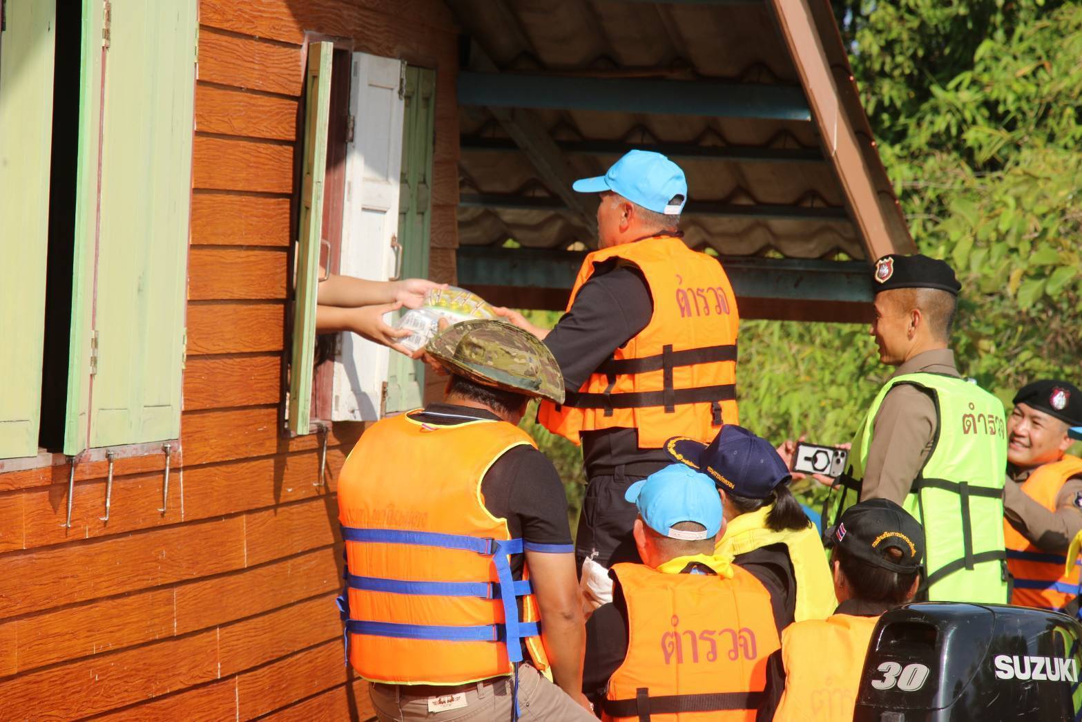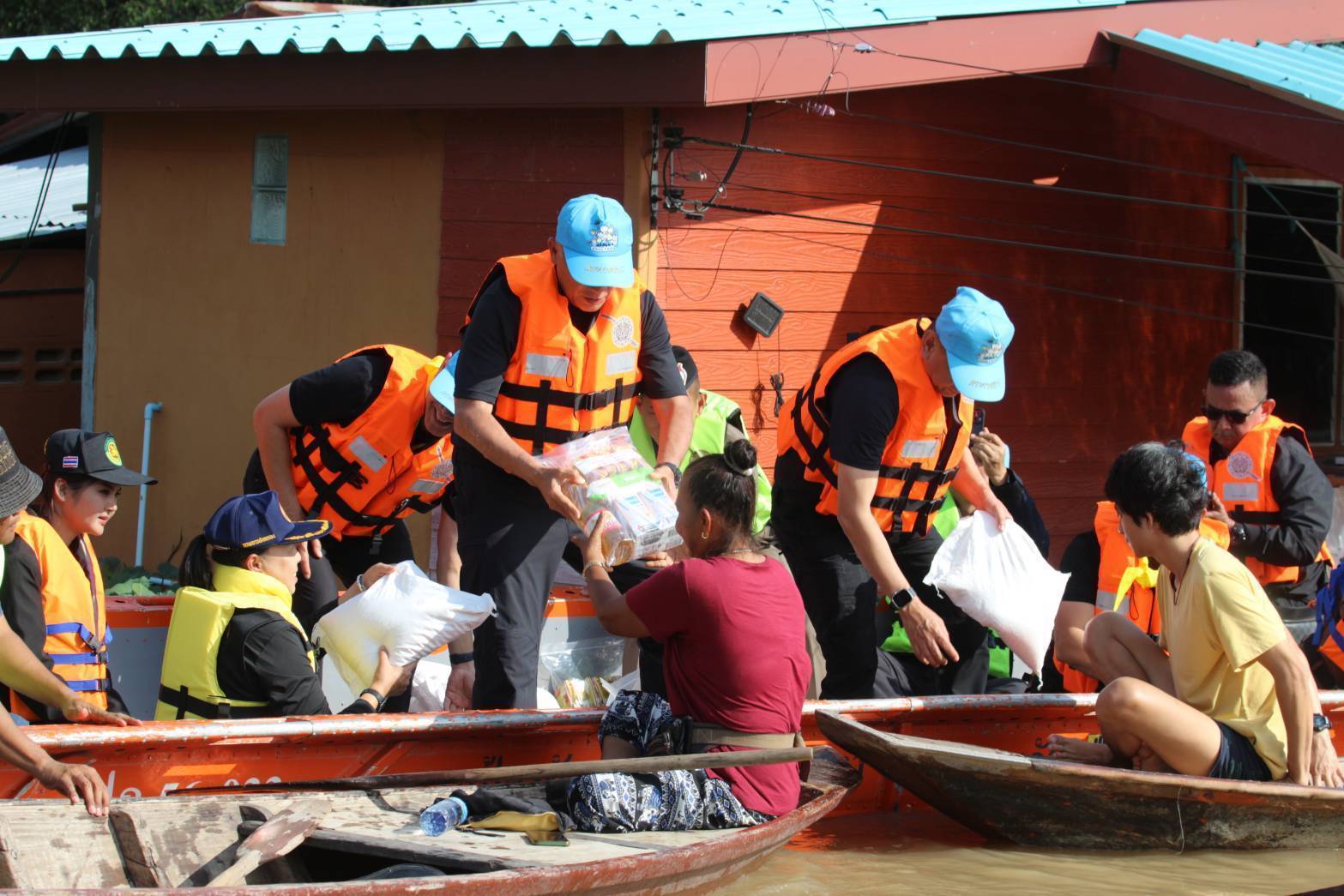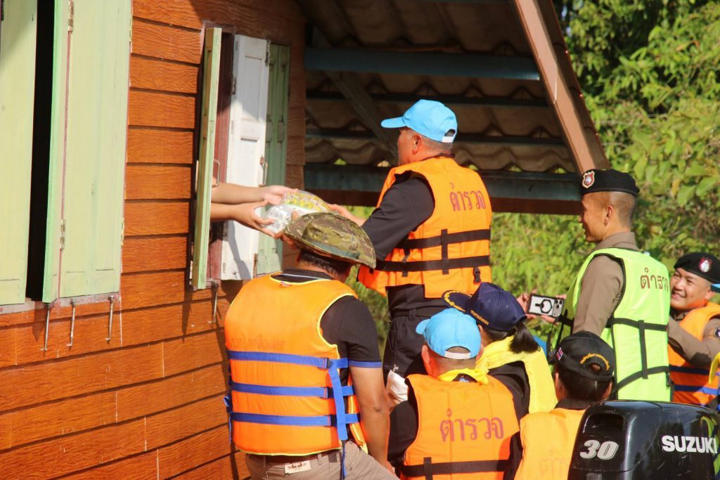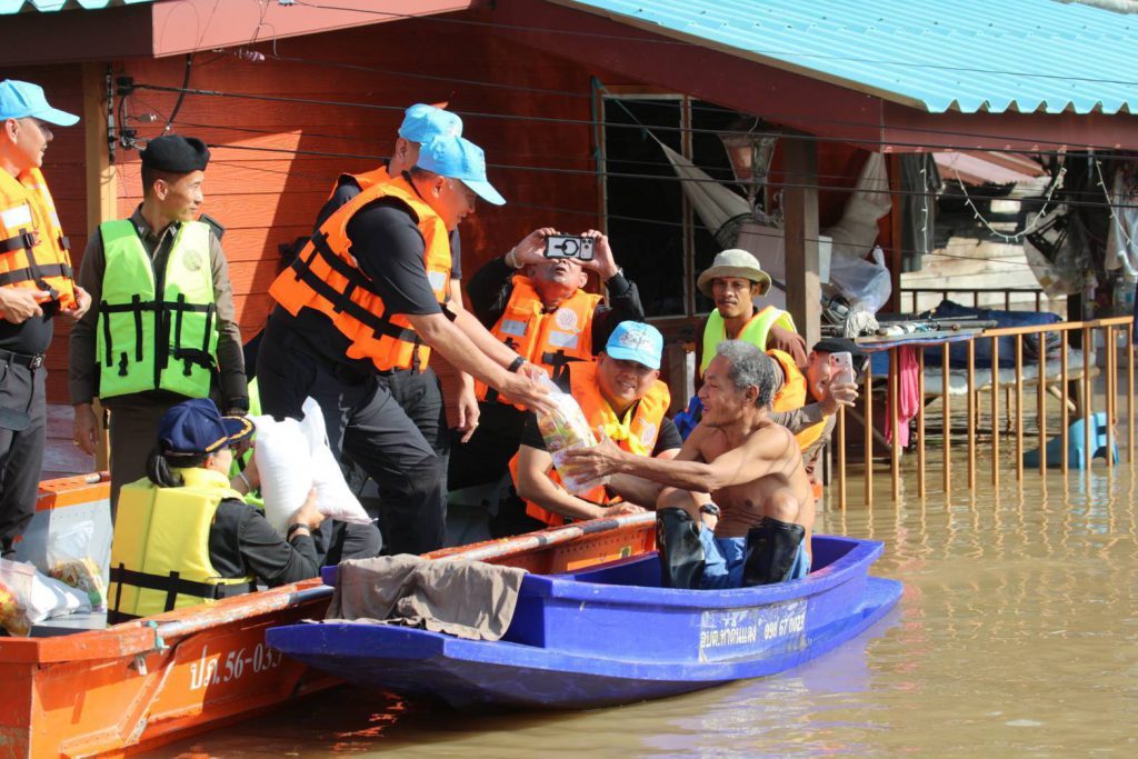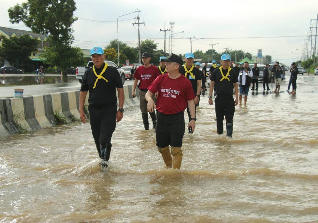 ขึ้นเรือตรวจเยี่ยมและมอบสิ่งของบำรุงขวัญให้ผู้ประสบอุทกภัย (ถุงยังชีพและยารักษาโรค) ณ อบต.ท่าดินแดง อ.ผักไห่ จ.พระนครศรีอยุธยา